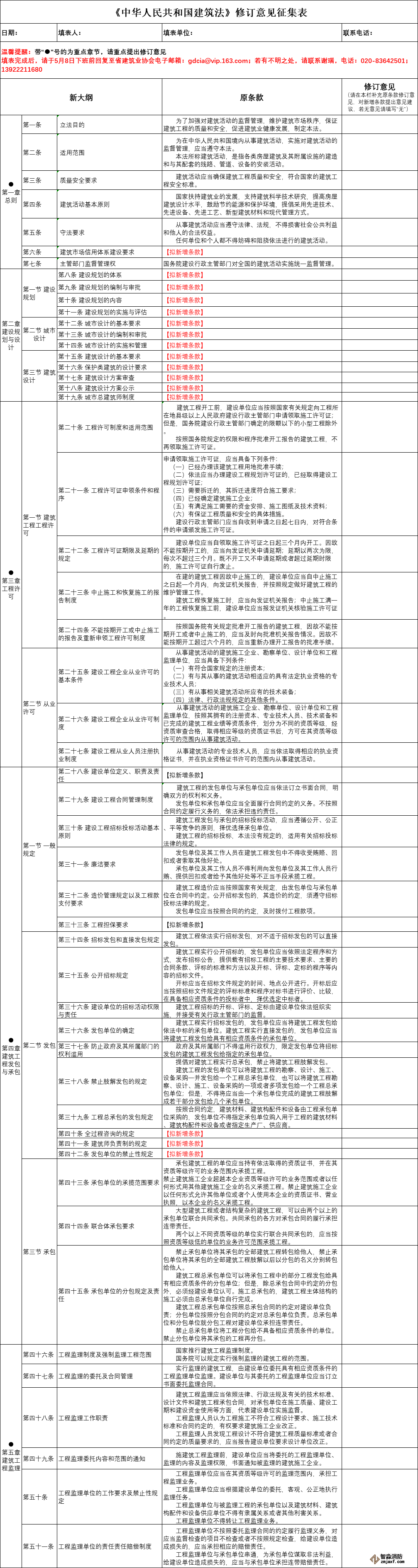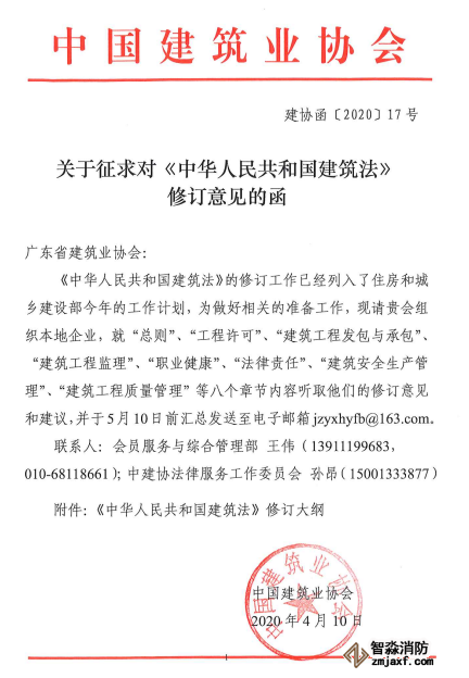 現(xiàn)將中國建筑業(yè)協(xié)會《關(guān)于征求對〈中華人民共和國建筑法〉修訂意見的函》(建協(xié)函〔2020〕17號)轉(zhuǎn)發(fā)給你們,請根據(jù)文件要求組織相關(guān)人員,重點就《中華人民共和國建筑法》“總則”、“工程許可”、“建筑工程發(fā)包與承包”、“建筑工程監(jiān)理”、“建筑安全生產(chǎn)管理”、“建筑工程質(zhì)量管理”、“職業(yè)健康”、“法律責(zé)任”等八個章節(jié)提出修訂意見和建議,其他章節(jié)修訂意見亦可一并提出,將 《中華人民共和國建筑法》修訂意見征集表(附件2)于5月8日前發(fā)送至我協(xié)會郵箱,由我協(xié)會匯總后報送至中國建筑業(yè)協(xié)會,感謝大力支持!