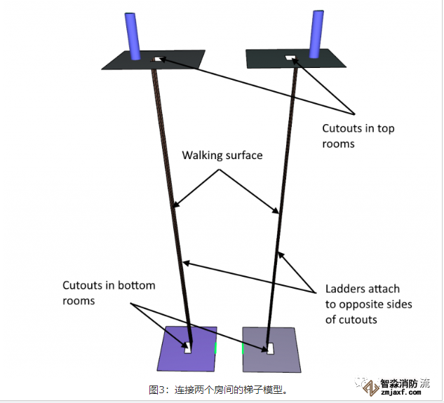 在此模型中,樓層之間的距離為20 m。頂層和底層的切口垂直對(duì)齊,尺寸為1 m x 0.5 m。由于梯子連接到孔的相對(duì)側(cè),因此梯子有一個(gè)輕微的傾斜。梯子的行走表面是梯子的表面,其法線具有較小的正Z分量。