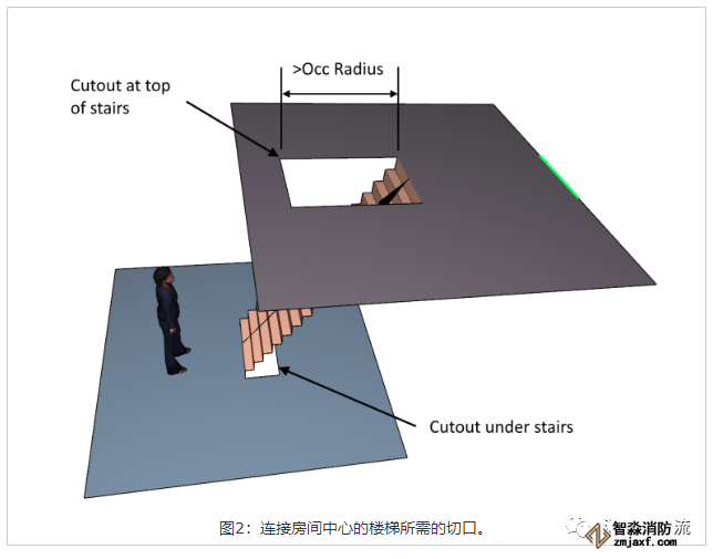圖1顯示了普通樓梯。樓梯的每一端必須連接到房間的邊界。如果樓梯連接房間的內(nèi)部,則必須在頂部和底部使用切口,如圖2所示。頂部切口必須大于乘員半徑,并且樓梯不能真正垂直,必須有一定的坡度。步行表面自然定義為樓梯的頂表面。
