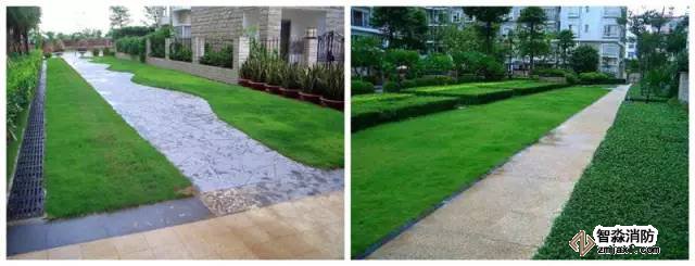 2 曲線化:將消防車道設計成曲折的步行小徑,采用種植草磚在小徑之外種植草皮,縮窄路面寬度,達到軟化、美化、綠化消防通道的目的。但由于草皮植土較淺,后期需要花費較多的養(yǎng)護費用。
