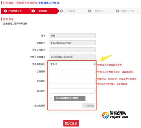 第五步:選擇常駐省份,先填寫手機(jī)號(hào)碼,拖動(dòng)滑塊解鎖短信發(fā)送,點(diǎn)擊發(fā)送短信,填寫驗(yàn)證碼和賬號(hào)密碼后進(jìn)行提交;