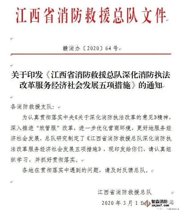 3、江西省消防救援總隊作為應(yīng)急管理部消防救援局確定的消防救援隊伍正規(guī)化建設(shè)試點單位,側(cè)重于執(zhí)法規(guī)范化建設(shè)試點。同時,為全面落實省委省政府“確保疫情防控有力有效、經(jīng)濟恢復(fù)有序有力”的部署要求,更好地支持企業(yè)復(fù)工復(fù)產(chǎn)服務(wù)經(jīng)濟社會發(fā)展,決定試點推行告知承諾管理。