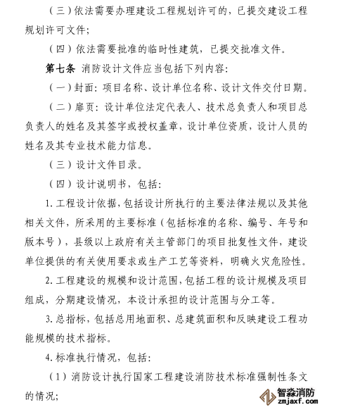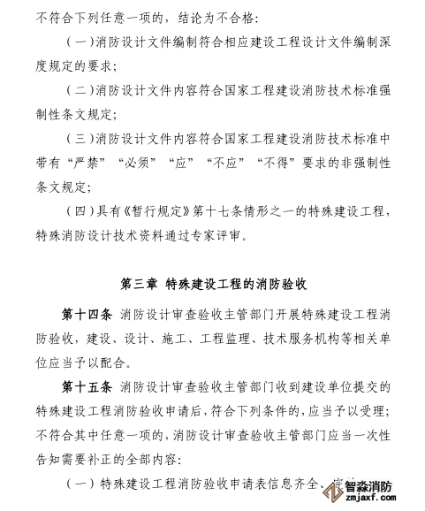 (三)消防設(shè)計文件符合國家工程建設(shè)消防技術(shù)標準(具有本規(guī)定第十七條情形之一的特殊建設(shè)工程,特殊消防設(shè)計技術(shù)資料通過專家評審)。