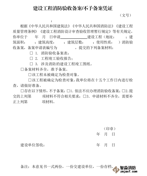 第三十五條 消防設(shè)計審查驗收主管部門收到建設(shè)單位備案材料后,對備案材料齊全的,應當出具備案憑證;備案材料不齊全的,應當一次性告知需要補正的全部內(nèi)容。