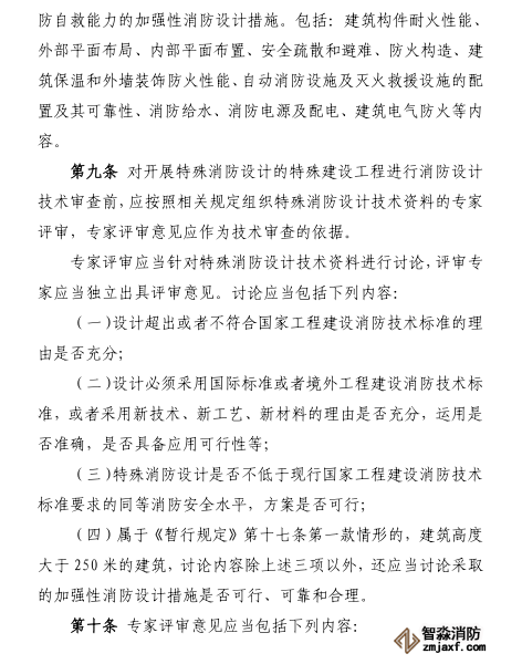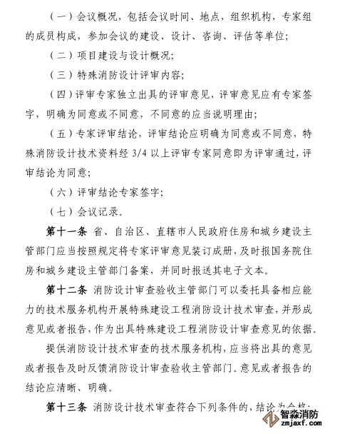 評審專家應當符合相關(guān)專業(yè)要求,總數(shù)不得少于七人,且獨立出具評審意見。特殊消防設(shè)計技術(shù)資料經(jīng)四分之三以上評審專家同意即為評審通過,評審專家有不同意見的,應當注明。省、自治區(qū)、直轄市人民政府住房和城鄉(xiāng)建設(shè)主管部門應當將專家評審意見,書面通知報請評審的消防設(shè)計審查驗收主管部門,同時報國務(wù)院住房和城鄉(xiāng)建設(shè)主管部門備案。