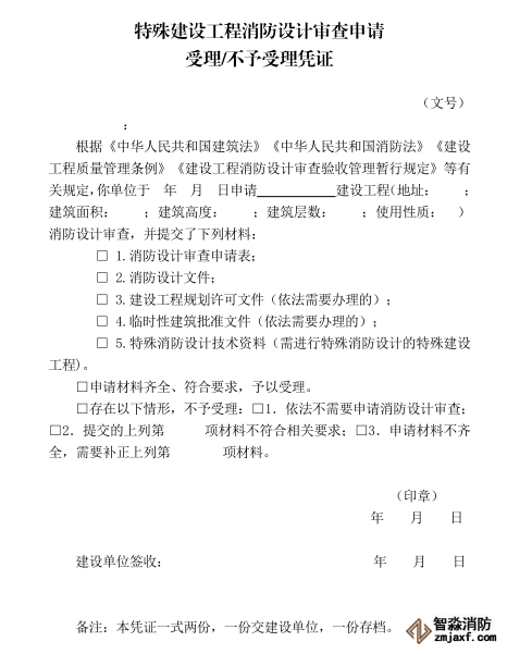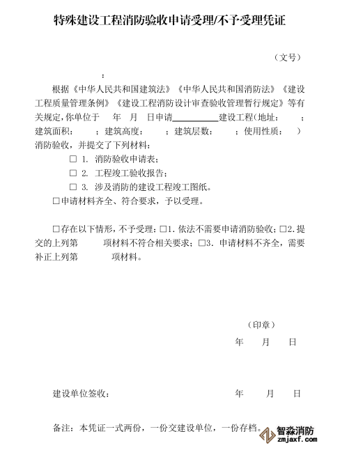消防設(shè)計審查驗收主管部門收到建設(shè)單位提交的消防驗收申請后,對申請材料齊全的,應當出具受理憑證;申請材料不齊全的,應當一次性告知需要補正的全部內(nèi)容。