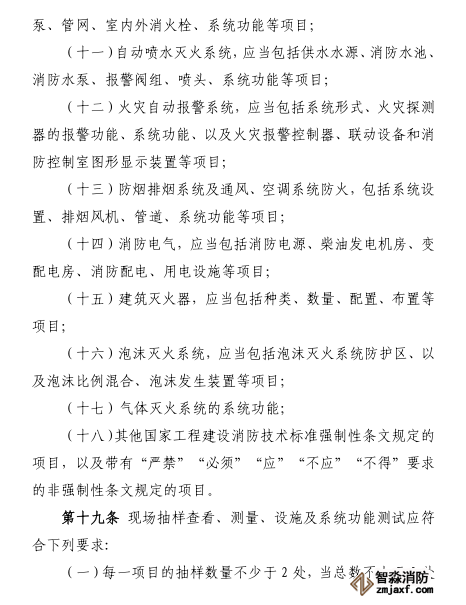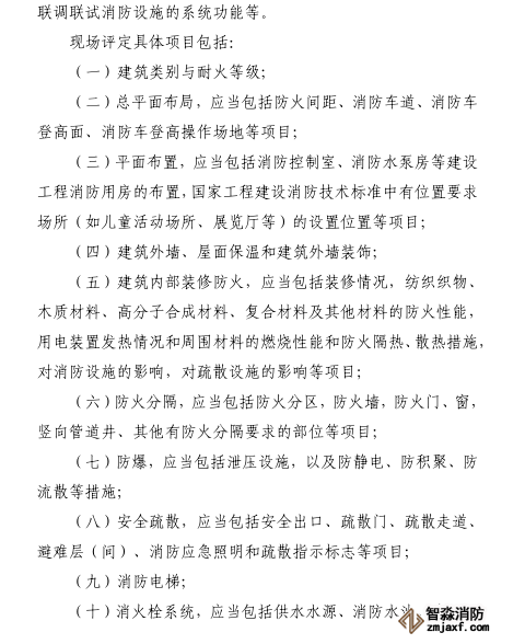 第二十九條 消防設(shè)計審查驗收主管部門受理消防驗收申請后,應當按照國家有關(guān)規(guī)定,對特殊建設(shè)工程進行現(xiàn)場評定?,F(xiàn)場評定包括對建筑物防(滅)火設(shè)施的外觀進行現(xiàn)場抽樣查看;通過專業(yè)儀器設(shè)備對涉及距離、高度、寬度、長度、面積、厚度等可測量的指標進行現(xiàn)場抽樣測量;對消防設(shè)施的功能進行抽樣測試、聯(lián)調(diào)聯(lián)試消防設(shè)施的系統(tǒng)功能等內(nèi)容。