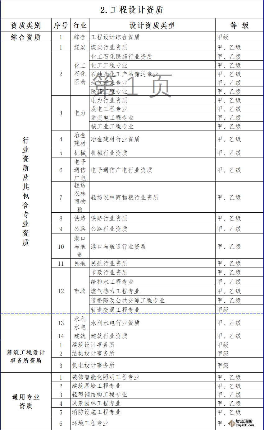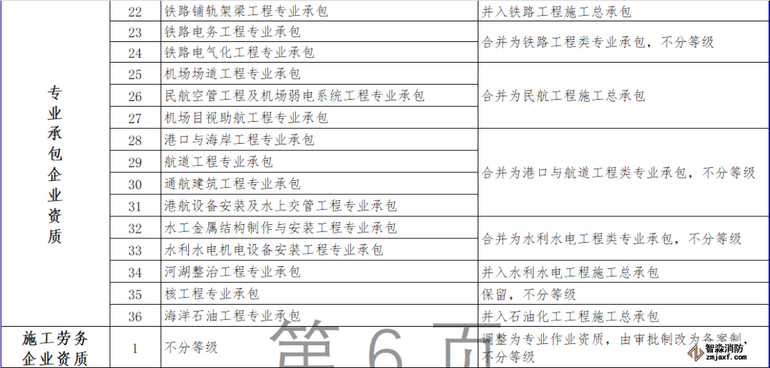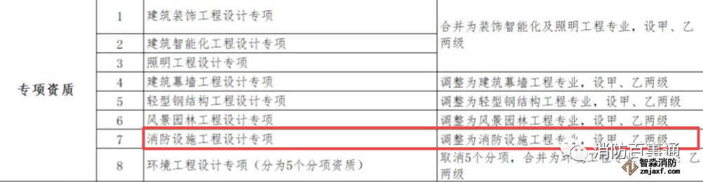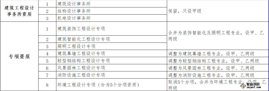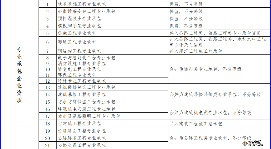 消防設(shè)施施工專業(yè)承包資質(zhì)和其他幾項資質(zhì)合并為通用類專業(yè)承包,不分等級。