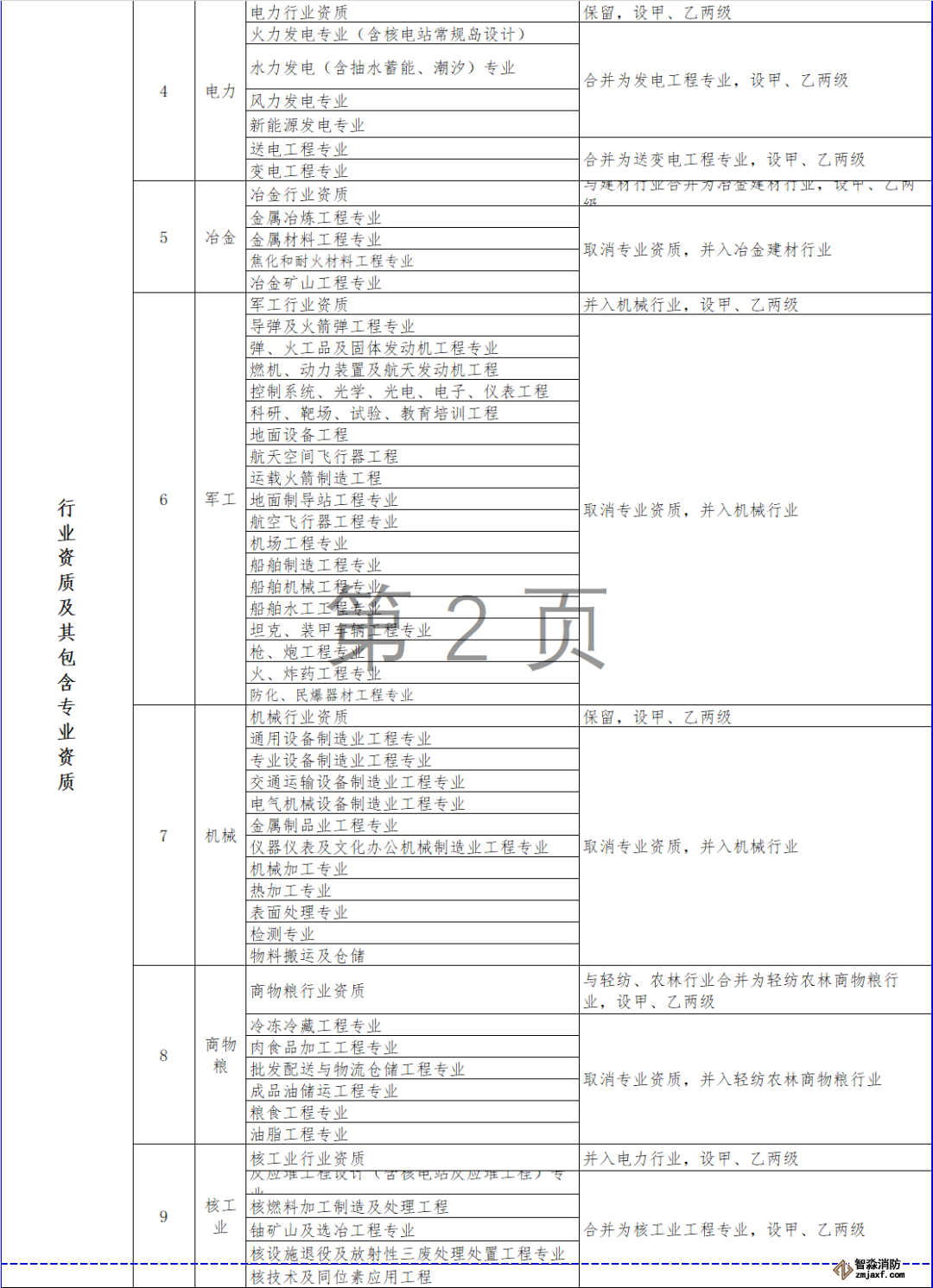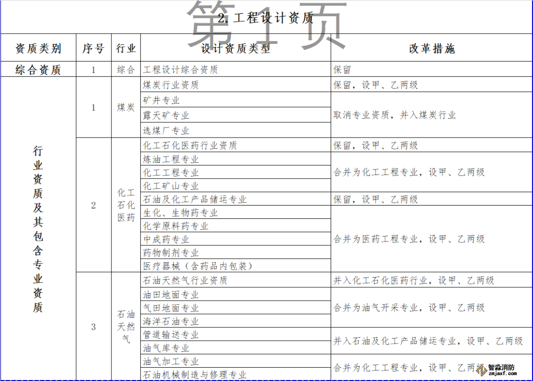 對部分行業(yè)資質(zhì)進(jìn)行整合,其中,冶金行業(yè)與建材行業(yè)合并為冶金建材行業(yè)資質(zhì),輕紡行業(yè)、農(nóng)林行業(yè)、商物糧行業(yè)合并為輕紡農(nóng)林商物糧行業(yè),電子行業(yè)、通信行業(yè)、廣電行業(yè)合并為電子通信廣電行業(yè),石油天然氣行業(yè)并入化工石化醫(yī)藥行業(yè),軍工行業(yè)并入機(jī)械行業(yè),核工業(yè)行業(yè)并入電力行業(yè),資質(zhì)等級壓減為甲、乙兩級,原丙級資質(zhì)并入相應(yīng)行業(yè)乙級資質(zhì)。
