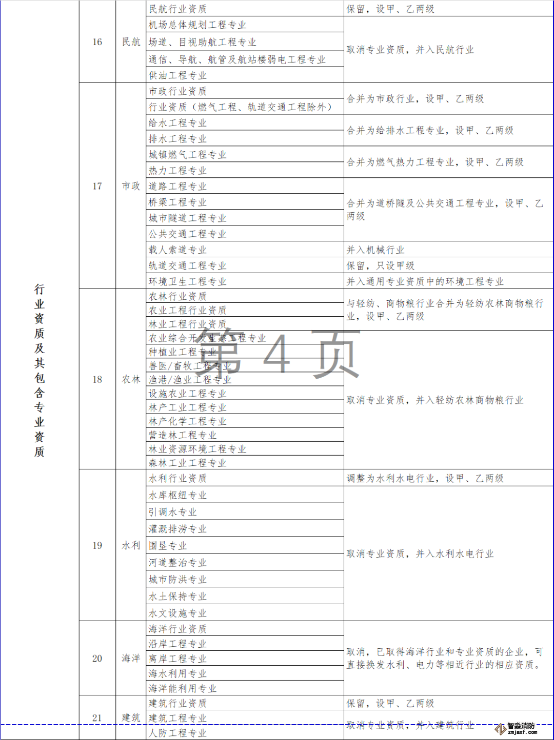取消海洋行業(yè)及專業(yè)資質(zhì),相關(guān)企業(yè)可以換發(fā)相近行業(yè)資質(zhì)。整合原化工石化醫(yī)藥、石油天然氣、電力、市政行業(yè)中的專業(yè)資質(zhì),資質(zhì)等級壓減為甲、乙兩級,原丙級資質(zhì)并入相應(yīng)專業(yè)乙級資質(zhì);取消其他行業(yè)的專業(yè)資質(zhì),并入相應(yīng)行業(yè)資質(zhì),原甲、乙級專業(yè)資質(zhì)并入相應(yīng)等級的行業(yè)資質(zhì),原丙級專業(yè)資質(zhì)并入乙級行業(yè)資質(zhì)。