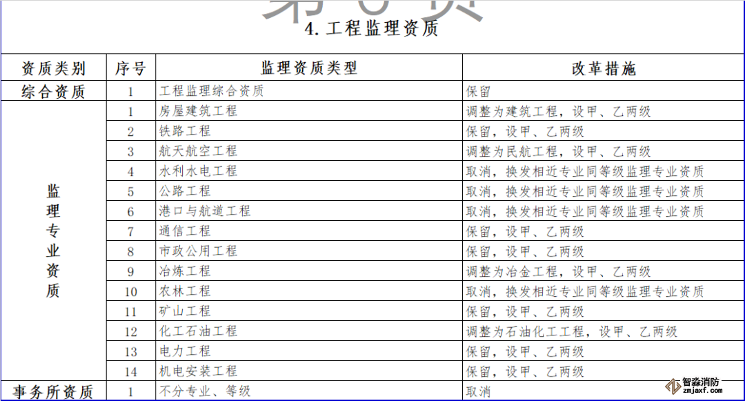 (四)工程監(jiān)理資質(zhì)。保留綜合資質(zhì)。取消水利水電工程、公路工程、港口與航道工程等專業(yè)資質(zhì),其資質(zhì)要求執(zhí)行有關(guān)行業(yè)主管部門規(guī)定。取消農(nóng)林工程監(jiān)理資質(zhì),建設(shè)單位委托農(nóng)林工程監(jiān)理業(yè)務(wù)時,不再作資質(zhì)要求。上述4個監(jiān)理專業(yè)資質(zhì)取消后,相關(guān)企業(yè)可以換發(fā)相近專業(yè)同等級監(jiān)理專業(yè)資質(zhì)。監(jiān)理專業(yè)資質(zhì)等級壓減為甲、乙兩級,原丙級資質(zhì)并入相應(yīng)專業(yè)的乙級資質(zhì)。取消事務(wù)所資質(zhì)。