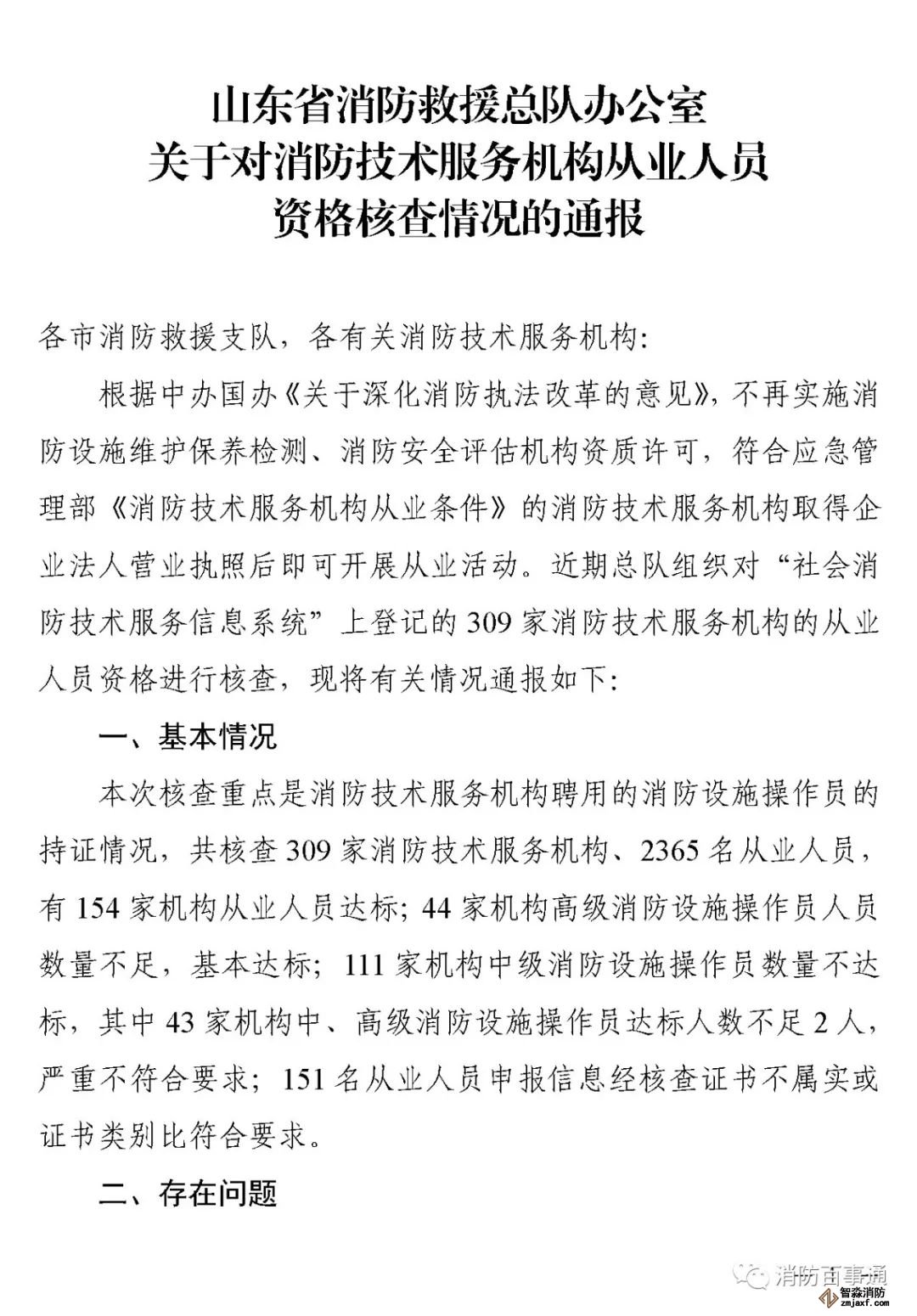 近日,山東省消防救援總隊(duì)辦公室通報(bào)了對消防技術(shù)服務(wù)機(jī)構(gòu)從業(yè)人員資格核查情況: