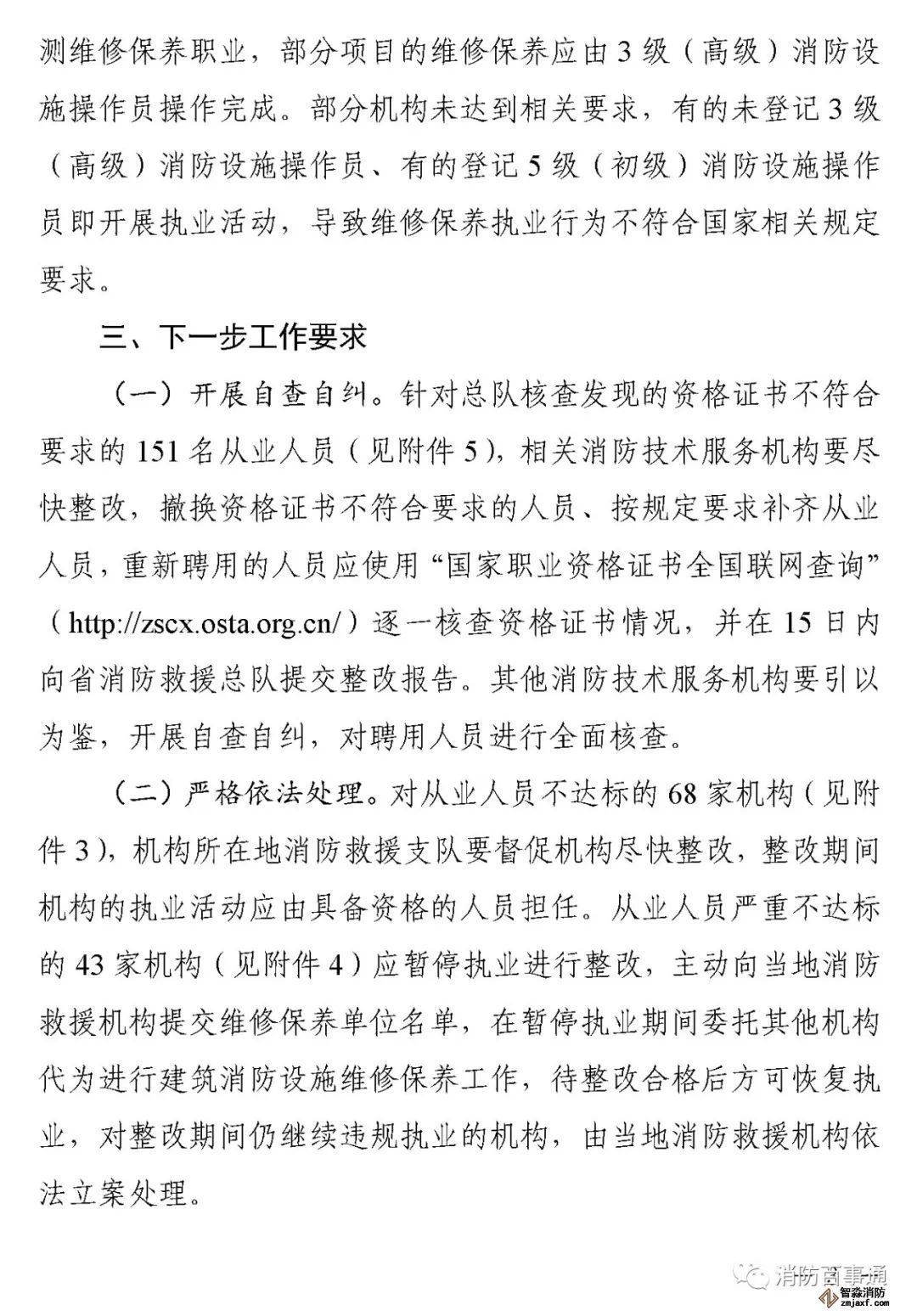 3、部分機(jī)構(gòu)不掌握從業(yè)條件要求。《消防技術(shù)服務(wù)機(jī)構(gòu)從業(yè)條件》要求“取得消防設(shè)施操作員國家職業(yè)資格證書的人員不少于6人,其中中級技能等級以上的不少于2人”,國家職業(yè)技能標(biāo)準(zhǔn)《消防設(shè)施操作員》要求4級以上人員方可從事消防設(shè)施檢測維修保養(yǎng)職業(yè),部分項(xiàng)目的維修保養(yǎng)應(yīng)由3級(高級)消防設(shè)施操作員操作完成。