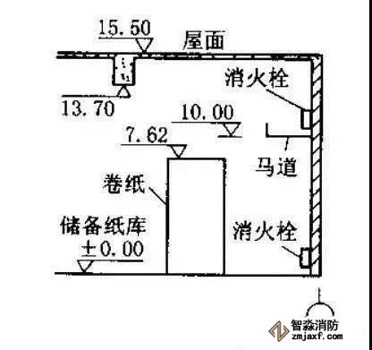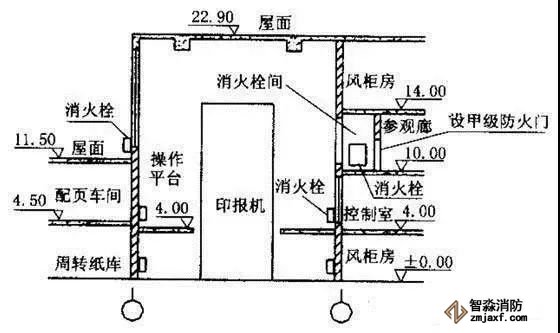 對于儲備紙庫,以消防員站在0.00m標(biāo)高地面上,按式(1)計(jì)算,水槍充實(shí)水柱應(yīng)在16.7~20.5m之間。故向建筑專業(yè)提出要求,在紙庫內(nèi)墻10.00m標(biāo)高處增加一圈馬道,在馬道設(shè)置消火栓,以減少充實(shí)水柱長度,見圖1。印報機(jī)廠房在0.00m標(biāo)高和4.00m標(biāo)高各有一個工作平臺。以消防員站在4.00m標(biāo)高平臺,按式(1)計(jì)算,水槍充實(shí)水柱應(yīng)在20.6~25.2m之間。故考慮在廠房北邊11.50m標(biāo)高屋面上設(shè)置消火栓,通過廠房高大的窗戶向室內(nèi)噴水。在廠房南邊10.00m標(biāo)高的參觀廊(屬于另一防火分區(qū))設(shè)專門的消防栓小間,供消防員使用,消火栓小間用甲級防火門與參觀廊隔開,見圖2。按圖2設(shè)置消火栓,水槍充實(shí)水柱為15m,在11.50m標(biāo)高屋面上水槍上傾角為45°,在10.00m標(biāo)高的消火栓小間水槍上傾角為53°,就可以滿足滅火要求。