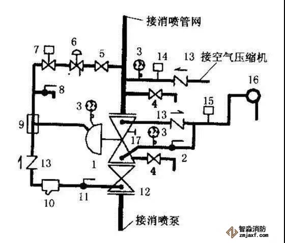 注:1、主閥體 2、報警測試閥 3、壓力表 4、排水閥 5、重置閥 6、 PORV壓力控制導(dǎo)閥 7、電磁閥 8、緊急啟動閥 9、加速器 10、過濾器 11、球閥 12、水源控制閥 13、止回閥 14、低氣壓監(jiān)測開關(guān) 15、高壓水流報警開關(guān) 16、水力警鈴 17、積水測試器