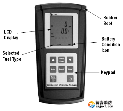 Func功能鍵用于選擇708的功能模式,讓您可以設(shè)定708作為一個燃燒分析儀,壓力表,溫度計,或可燃檢漏儀。此外,該功能鍵可用來訪問日期/和時間顯示。有關(guān)功能鍵的更多信息見第6條,