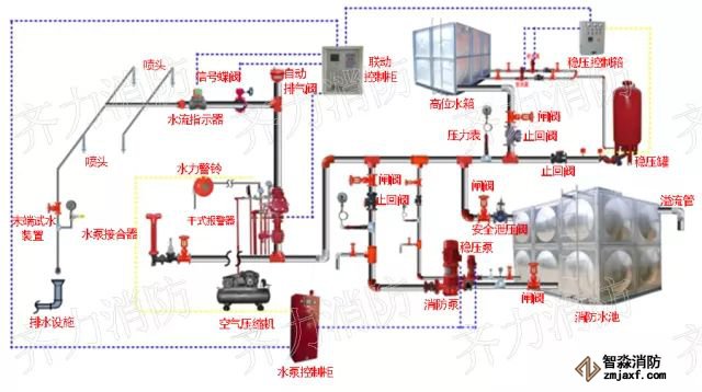 1)先后觸發(fā)防護區(qū)內(nèi)兩個火災(zāi)探測器,查看電磁閥、電動閥、消防水泵和水流指示器、壓力開關(guān)的動作情況及反饋信號,以及排氣閥的排氣情況。
